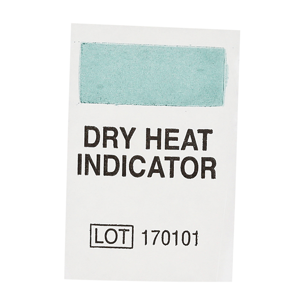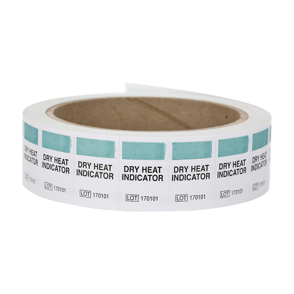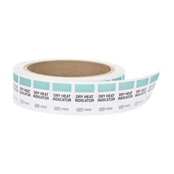 The labels are printed with a chemical indicator that changes from green to brown when exposed to Dry Heat conditions. This color change allows the technician to immediately distinguish processed from unprocessed items. Color change is non-reversible.